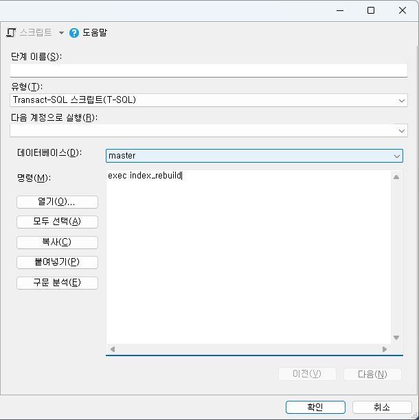 그리고 단계로 넘어가 실행 할 내용을 생성합니다. 새로만들기를 클릭 후 생성한 인덱스 리빌드 프로시저를 호출합니다.