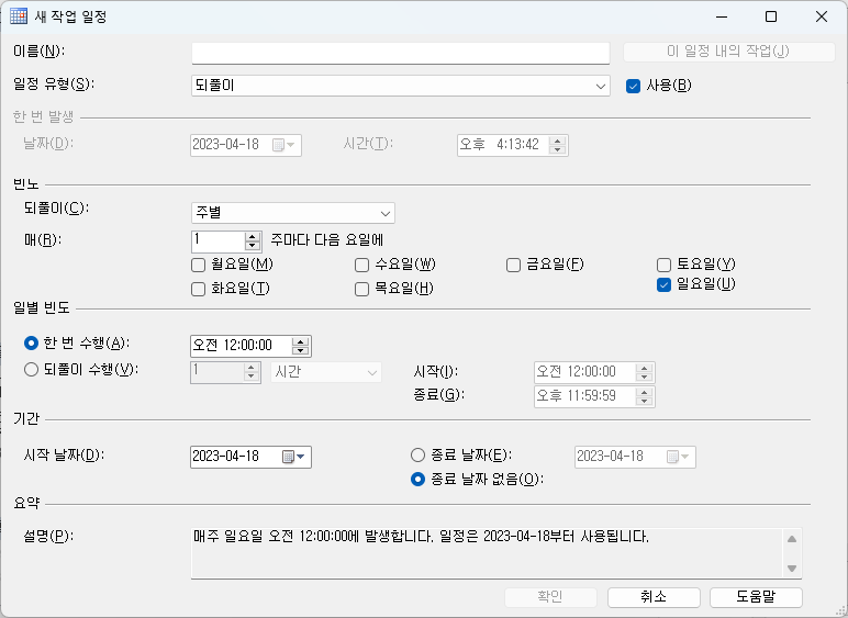 그리고 일정을 등록하여 언제마다 반복 작업 할 것인지 설정합니다.