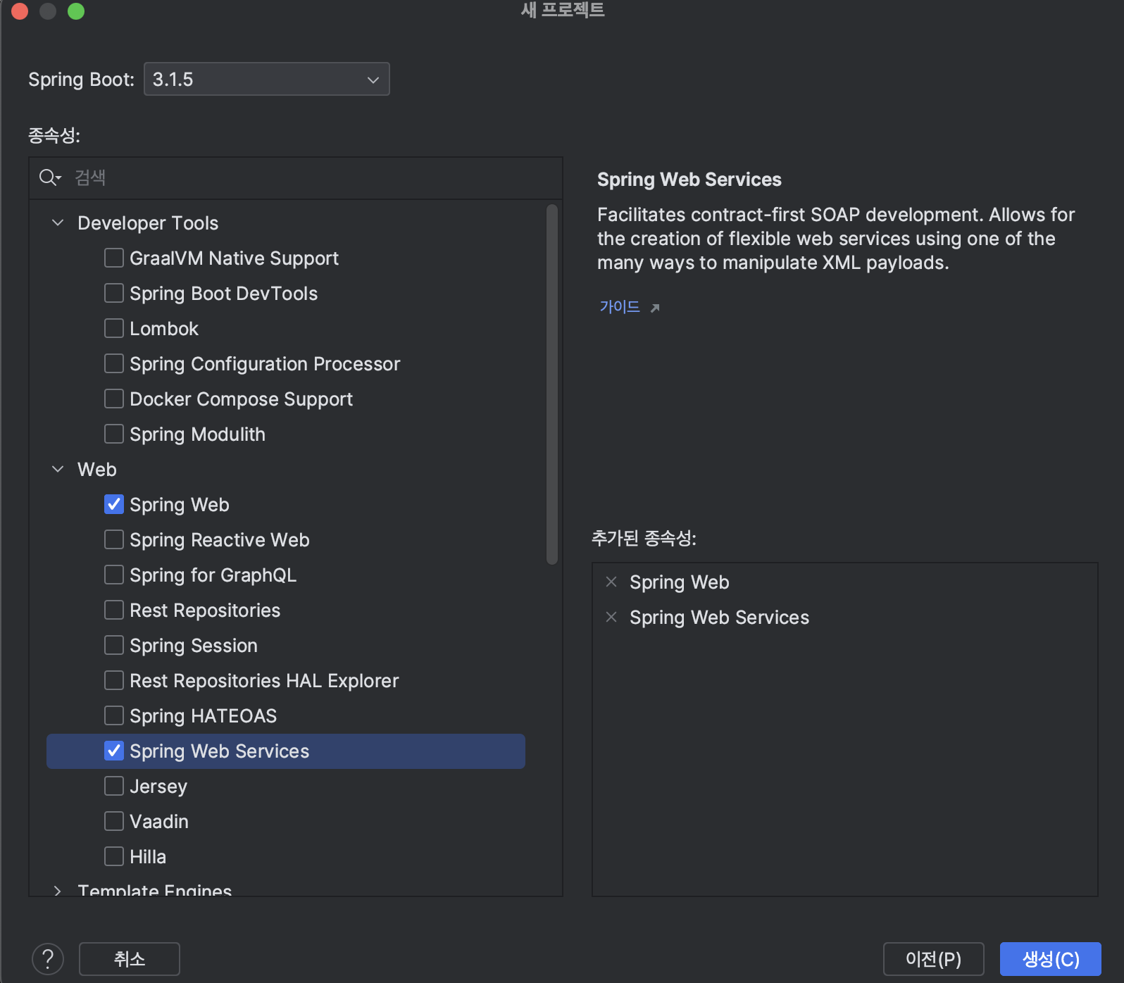 Java 11을 사용하시려면 Spring Boot 2.x 버전을 사용하시고, Java 17이상은 Spring Boot 3.X버전을 사용하시면 됩니다. 이후 생성을 누르시면 프로젝트가 생성이 됩니다.