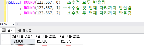 - ROUND : 지정한 자릿수로 반올림합니다. 예를 들어, 123.567을 소수점 한 자리로 반올림하면 123.6이 됩니다.