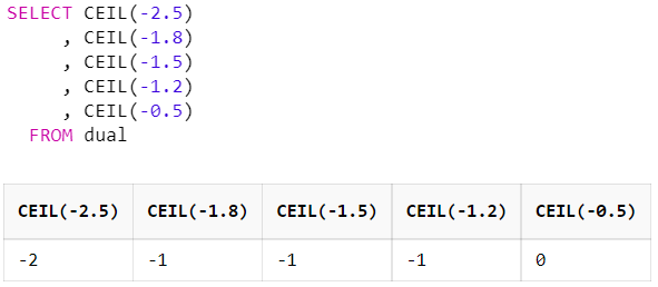 예를 들어, -2.5를 올림하면 -2가 됩니다. 다음과 같은 쿼리를 사용할 수 있습니다: