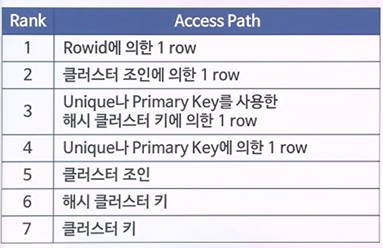 - 2위 : 클러스터 조인에 의한 1row (클러스터화된 테이블간의 조인을 통해서 1건의 데이터를 찾는 것을 말한다)