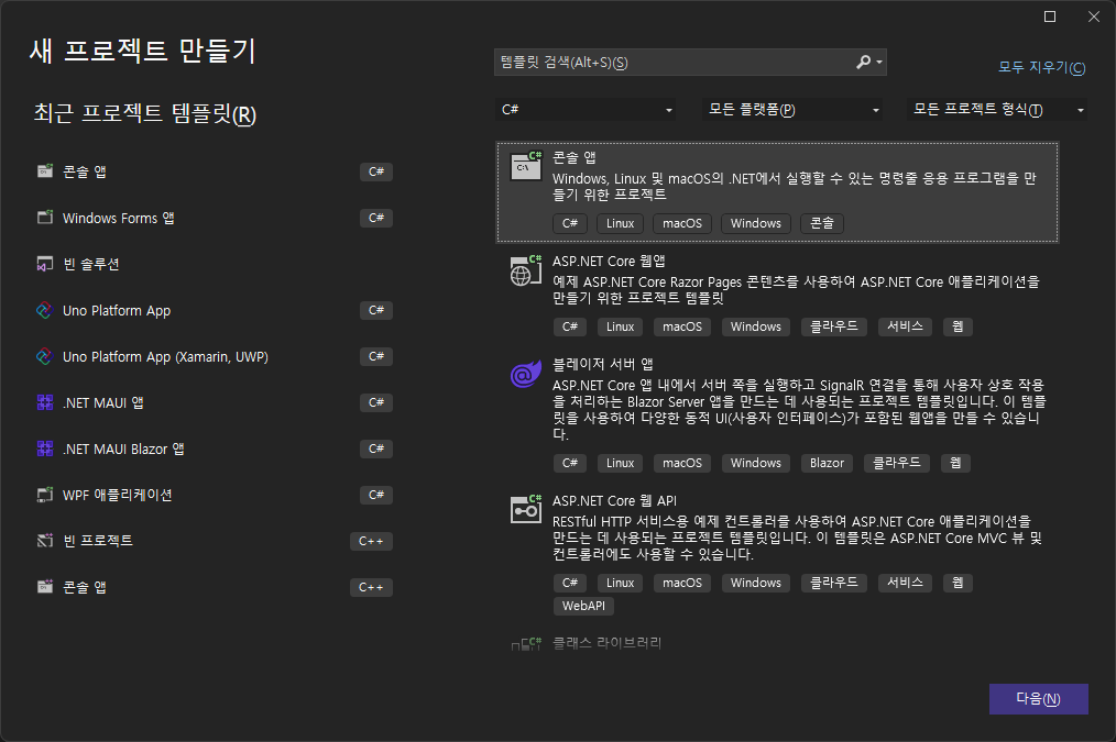 먼저, 콘솔 앱 프로젝트를 생성합니다.
