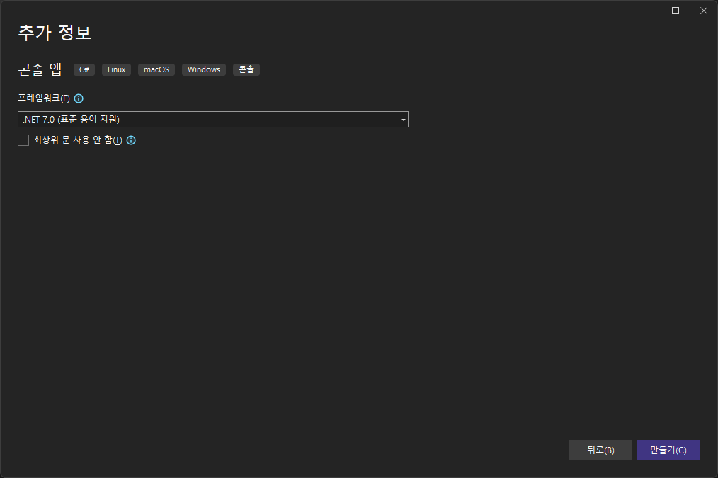저는 .NET 7.0 으로 셋팅하였습니다. 버전은 크게 무관합니다.