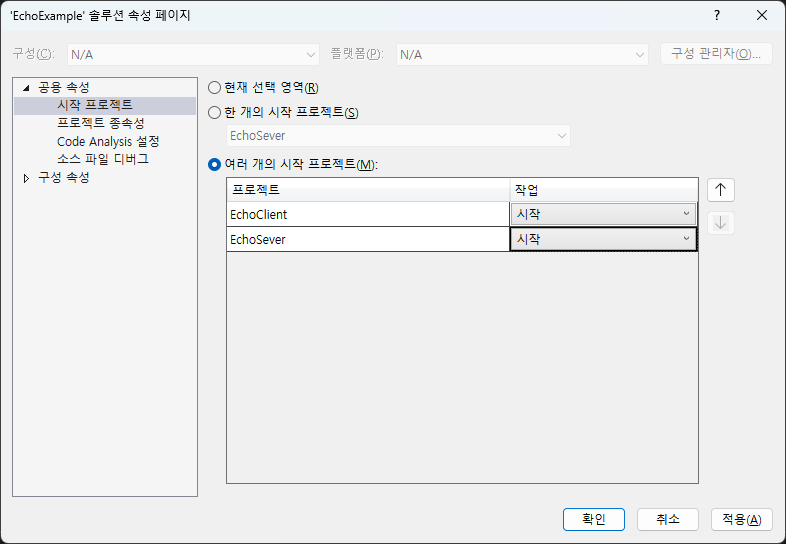 솔루션 우클릭 후 속성페이지에서 위와 같이 설정해주세요. 위 작업은 서버와 클라이언트 동시에 실행하기 위해 사용됩니다.