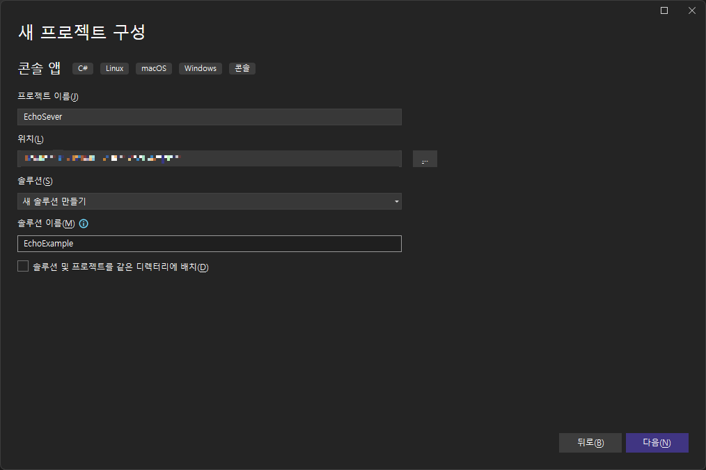 저는 프로젝트 서버를 먼저 구성하기 위해 프로젝트 명에는 EchoServer 그리고 솔루션명에는 EchoExample로 작성하였습니다.